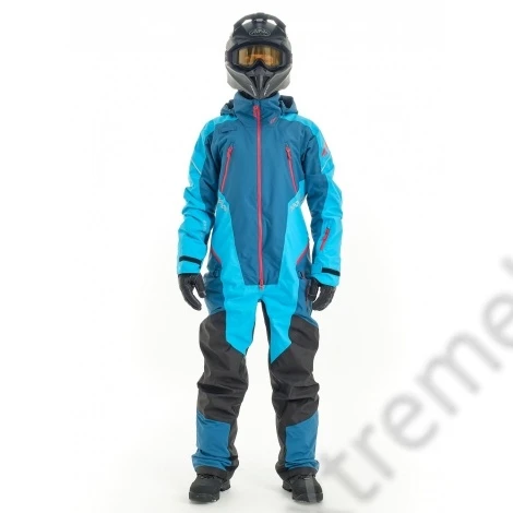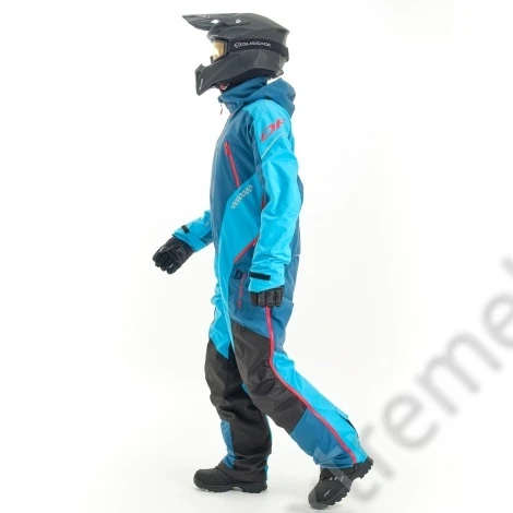 Комбинезон предназначен для снегохода, сноубайка и сноуборда. Надежно защитит от ледяного ветра и мокрого снега: ткань верха содержит водоотталкивающее покрытие. Внешние молнии влагозащитные. Проклеены все швы. На рукавах есть эластичные манжеты, на штанинах – снегозащитные "юбки" с петлёй для фиксации к ботинкам. При закрытой вентиляции и карманах комбинезон герметичен.
