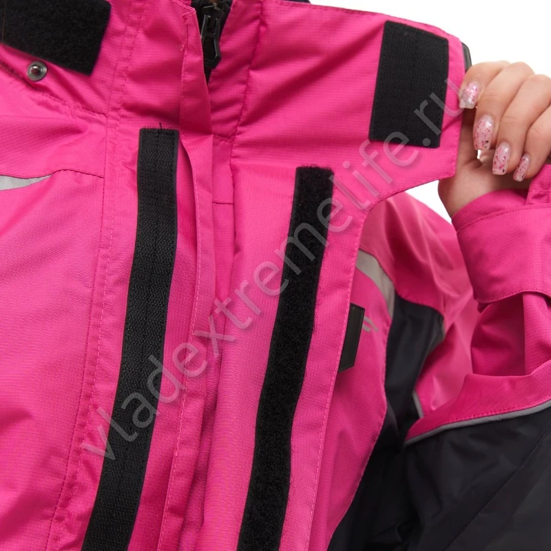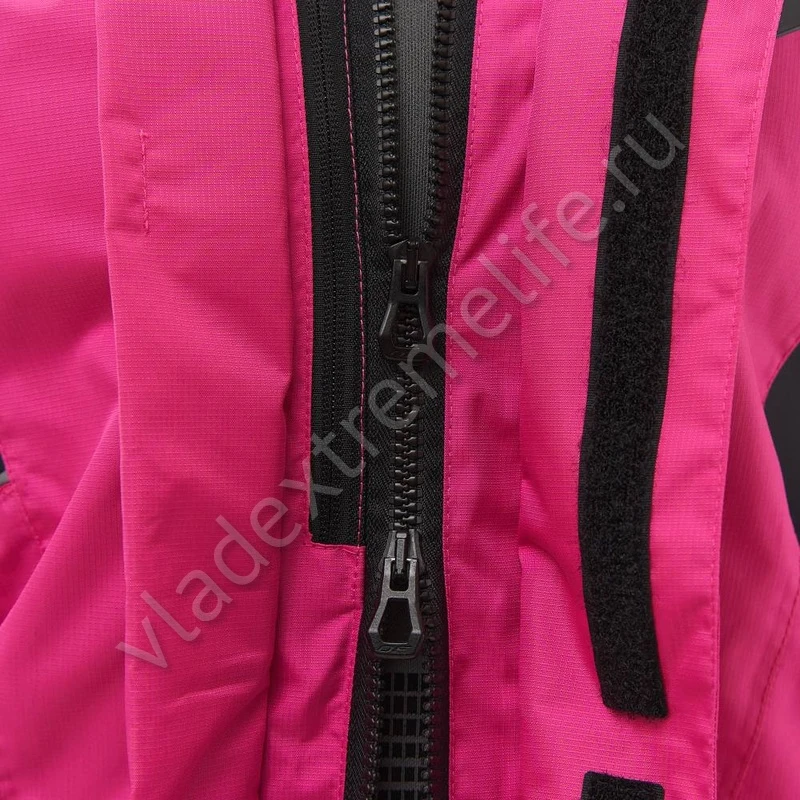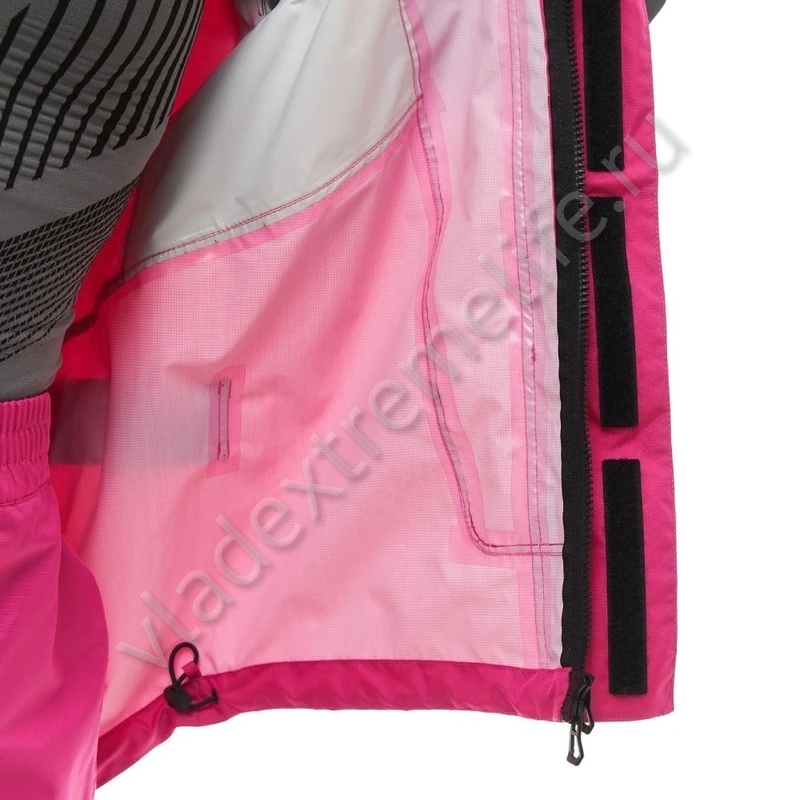 Имеет двухзамковую центральную молнию, которая закрывается двойной планкой с водоотводящим клапаном. Есть скрытый регулируемый капюшон. Все швы изделия герметичные. Продуманная система утяжки (сзади на талии, на предплечьях, запястьях) уменьшает парусность.