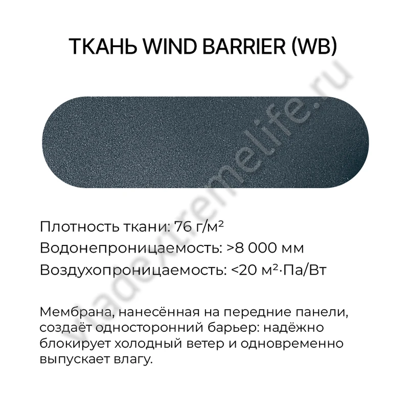 - Windbreak Fabric (WB) — это двухслойная ветрозащитная мембрана, которая надёжно блокирует холодный воздух, но при этом сохраняет воздухопроницаемость. Благодаря гидрофильной структуре она не задерживает влагу, обеспечивая сухость и комфорт во время активного движения.