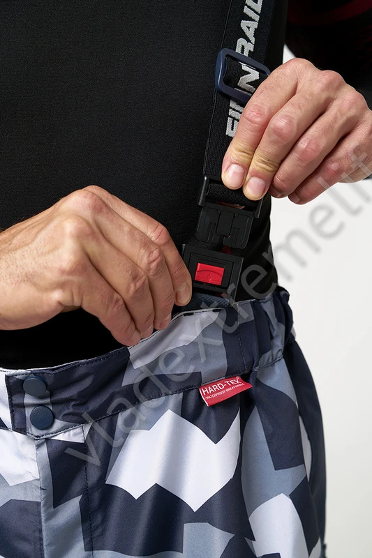Брюки оснащены высокой спинкой с эластичными подтяжками, регулируемыми по длине.