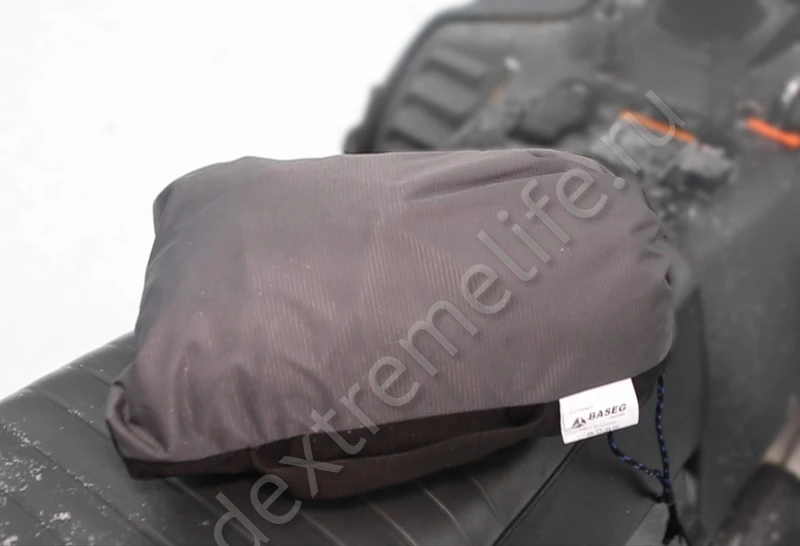 Транспортировочный чехол крепится к гусенице снегохода на специальные стропы и затягивается резинкой снизу, чтобы во время переезда его не разорвало от ветра. Чехол оборудован специальным клапаном для заправки снегохода.