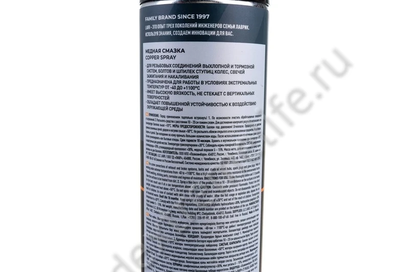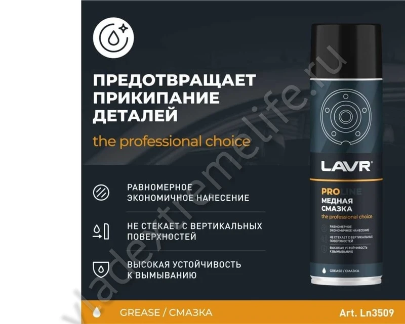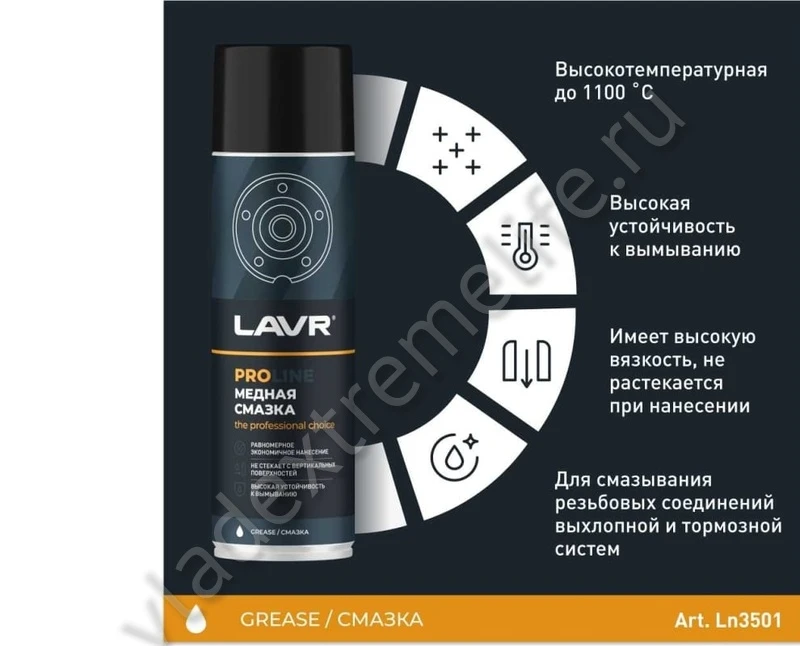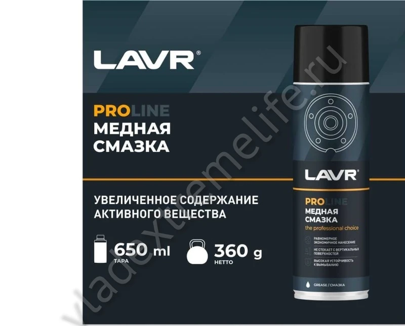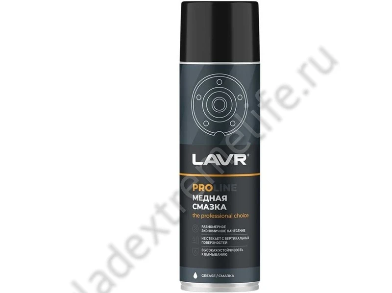 Медная смазка LAVR PROLINE, 650 мл Ln3509 предназначена для работы в условиях экстремальных температур от -40 до + 1100 ˚С. Смазка имеет высокую вязкость, не растекается при нанесении, обладает повышенной устойчивостью к воздействию окружающей среды. Применяется для смазывания резьбовых соединений выхлопной и тормозной систем, болтов и шпилек ступиц колёс, свечей зажигания и накаливания.